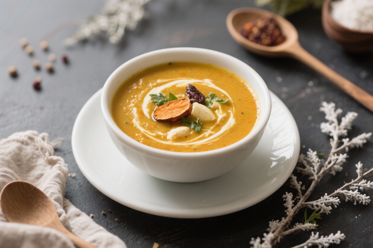 Final plated bowl, cozy evening vibe: A beautifully plated bowl of creamy winterliche Ayurveda Suppe